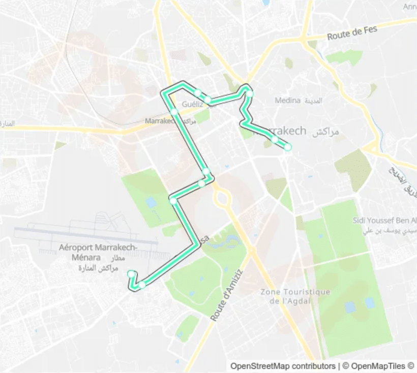Airport → Jardin Ménara → Menara Mall → Sofitel Marrakech → Sidi Mimoun → Jemaa el-Fna (Medina) → Bab Doukkala → Carré Eden (Gueliz) → Gare ONCF → Menara Mall → Jardin Ménara → Airport