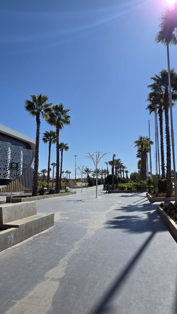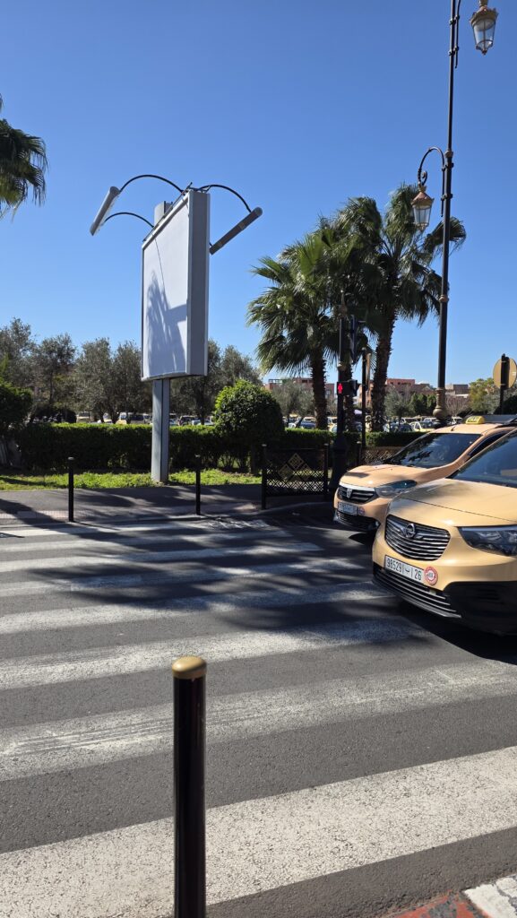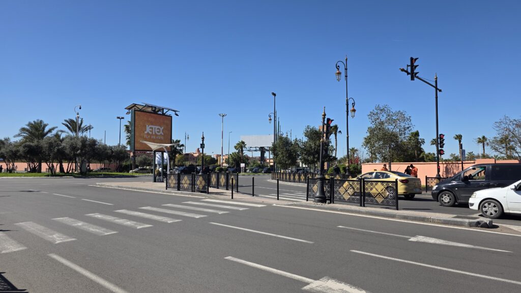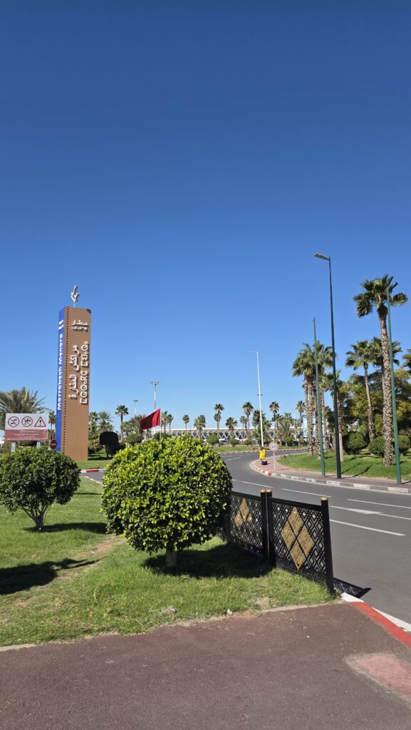 When you exit the terminal, instead of heading straight to the parking area, walk to the left and continue until you leave the airport grounds, about 8–10 minutes on foot. It’s safe, and along the way you’ll reach Avenue Guemassa, a main road where local transport is easier to find. Cross to the side of the avenue facing the airport terminal.