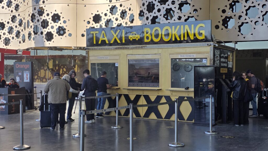 Just outside the arrivals terminal at Marrakech Menara Airport, a few meters to the right, you’ll see the official airport taxi booth. This is the designated system for taxis departing directly from the airport, and the process is now much more organized than it was in the past.